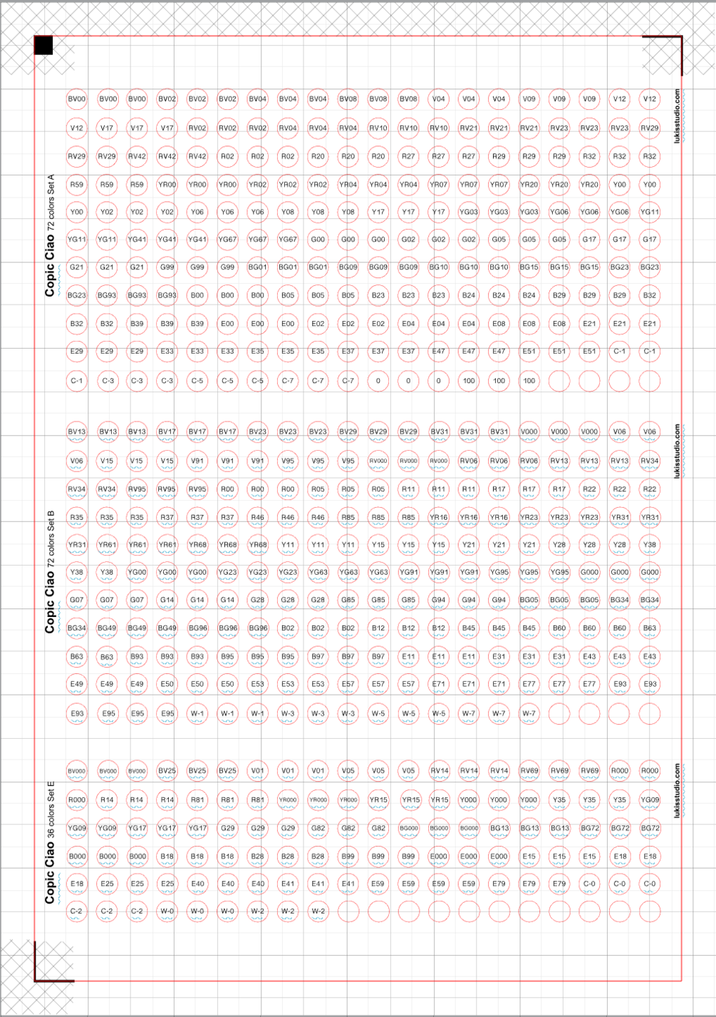 The labels include all 180 colors of Copic Ciao markers. Each color is available 3x (for both caps and 1 extra).