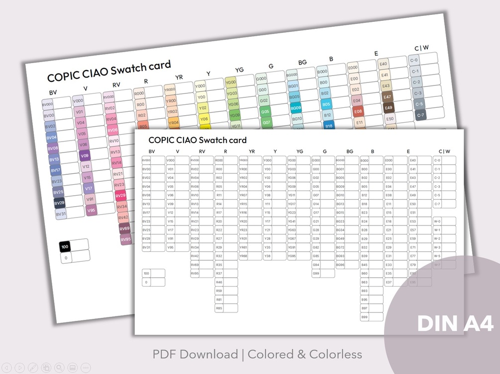 -coloredless Copic Ciao swatch card in A4 Format